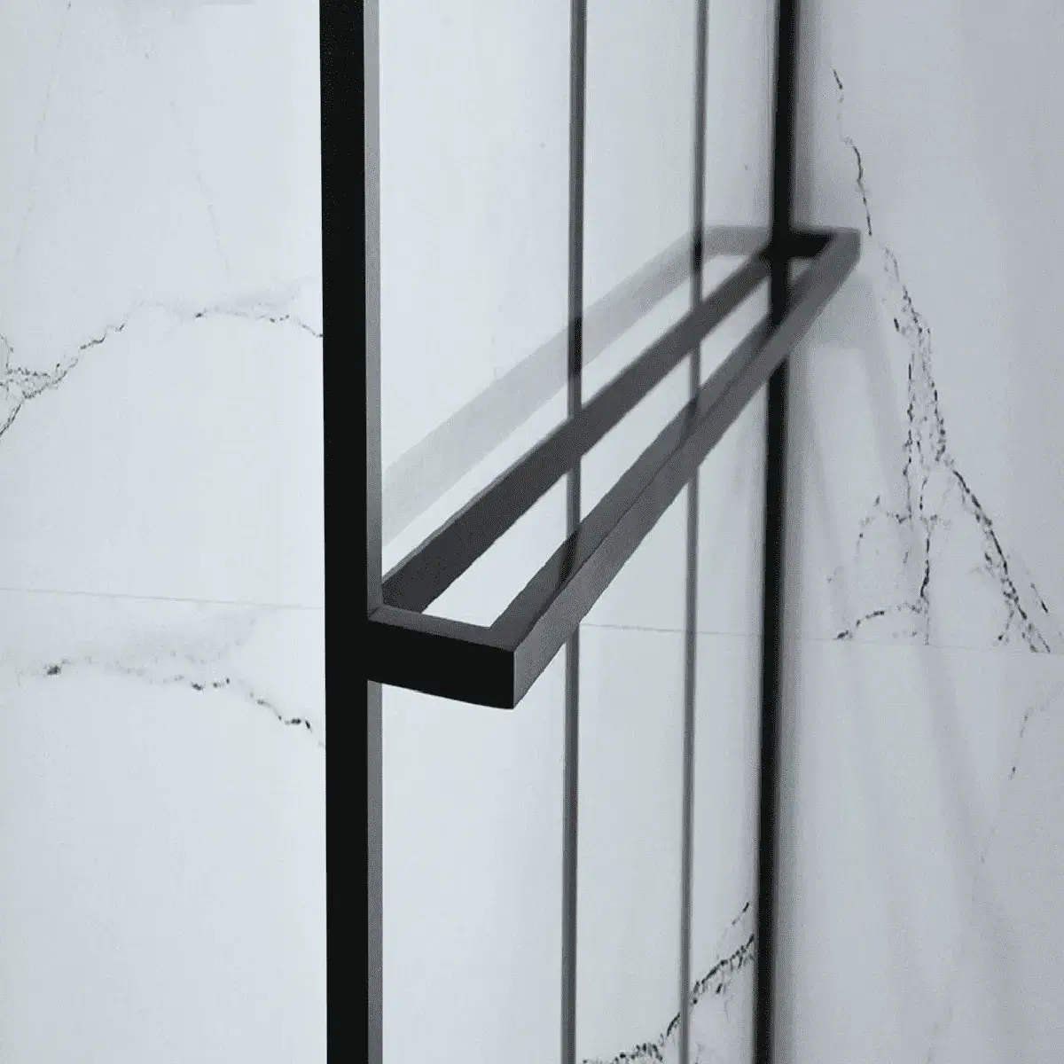 The AquaGlass Velar 8mm Black Framed Walk-In Front Shower Panel with Towel Rail combines style, functionality, and convenience. With its sleek black frame, durable safety glass, integrated towel rail, and easy-clean coating, it offers a modern and practical solution for transforming your shower space into a contemporary and inviting oasis.