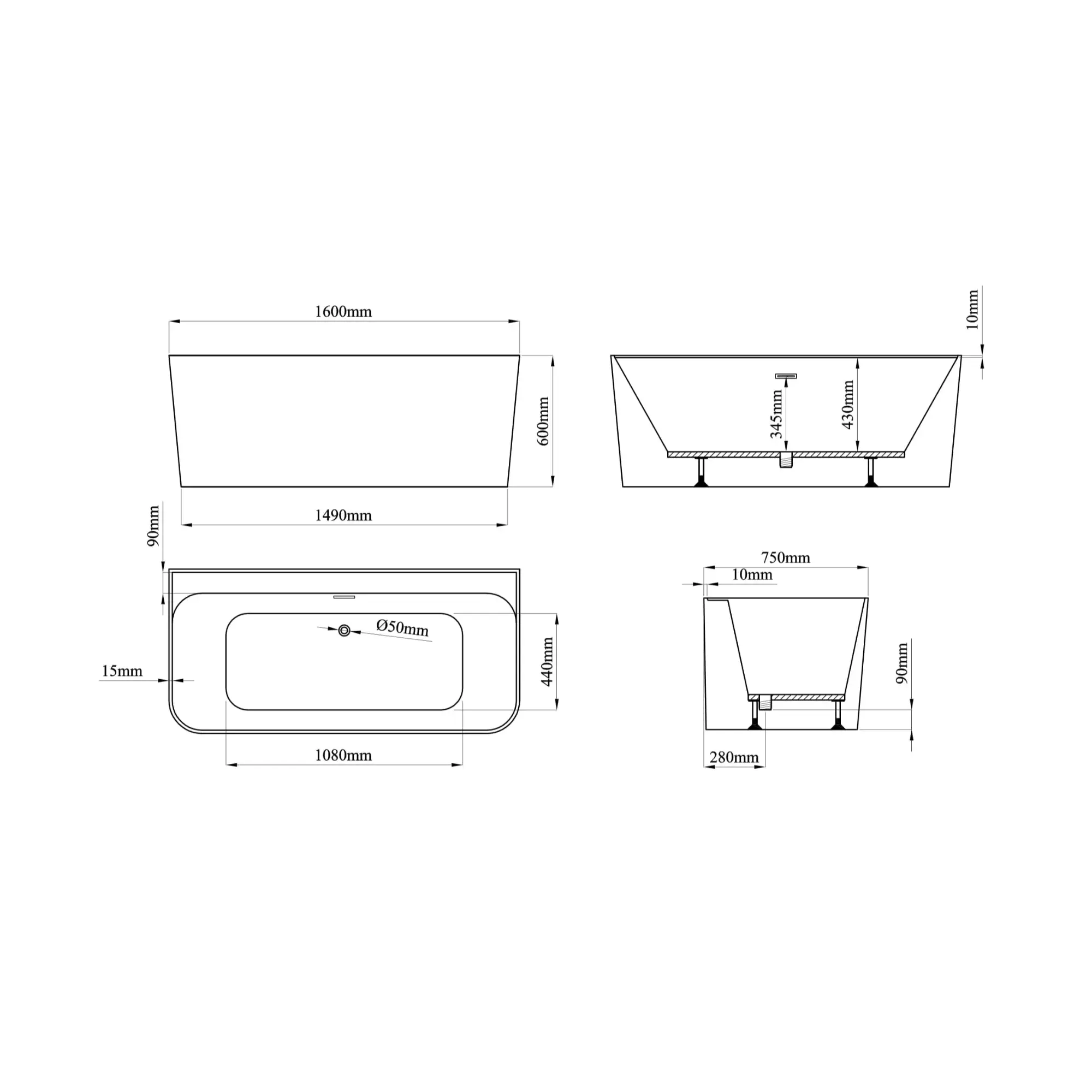 Brockland Sqaure 1600 x 750 x 600mm (430mm depth) Freestanding Bath - Gloss White