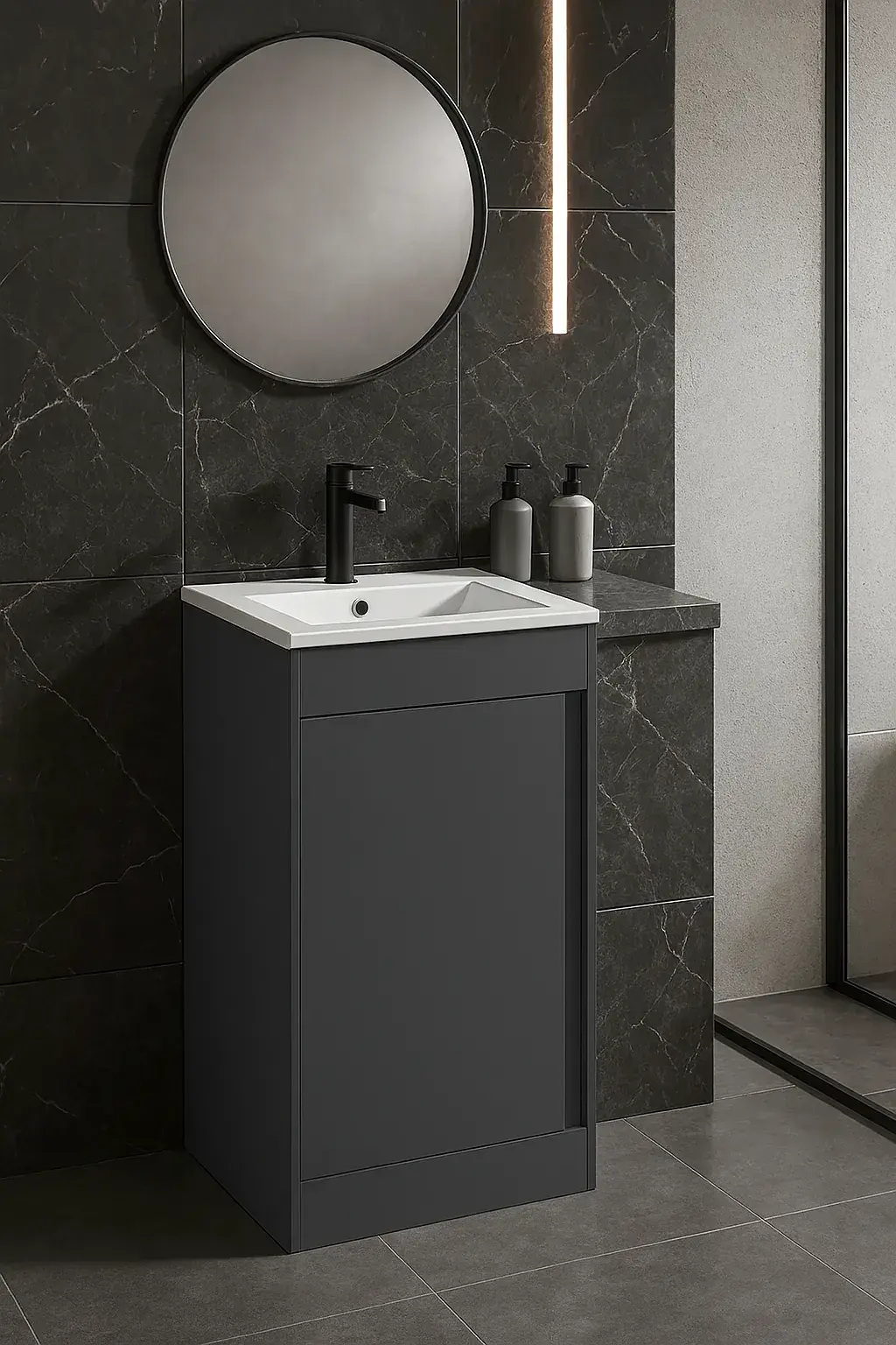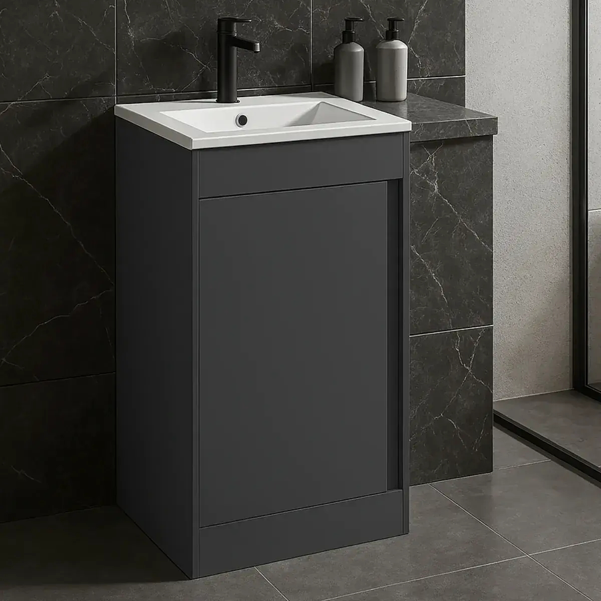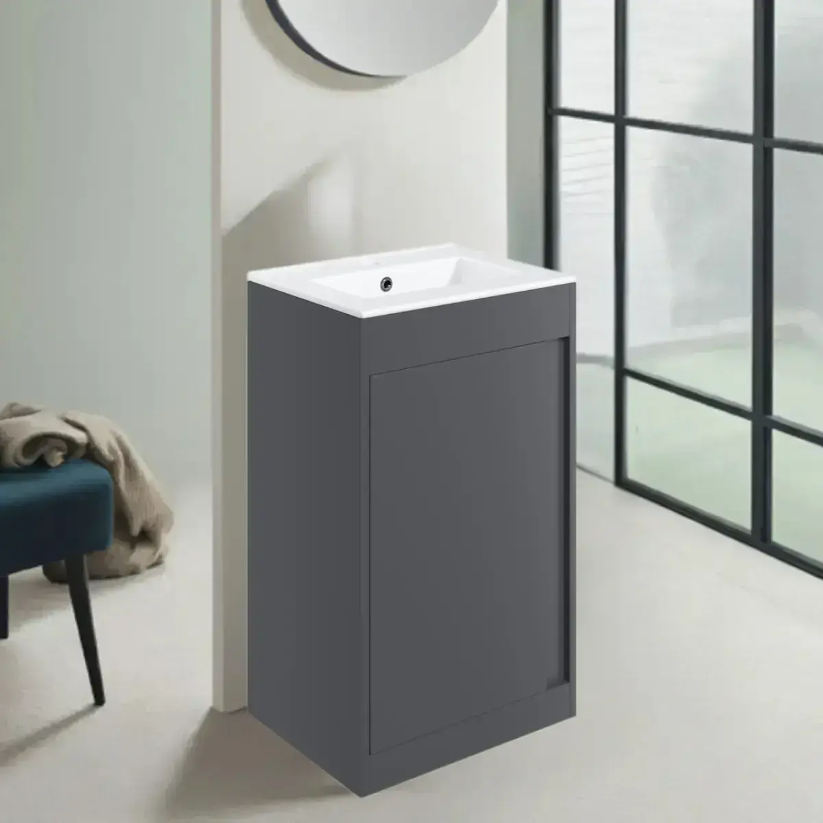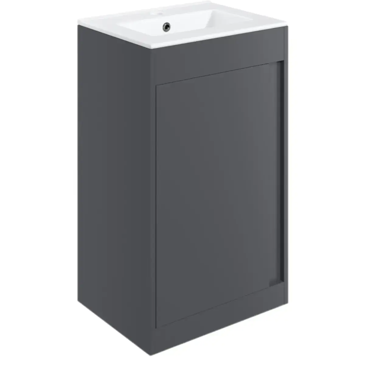 The Cruzz floor-standing 510mm base unit with ceramic basin in Matt Graphite Grey offers a sleek, modern vanity solution for bathrooms, cloakrooms, and en-suites. This pre-assembled unit features a soft-closing door and can be purchased either handleless (grip) design or with your choice of three stylish door handles.