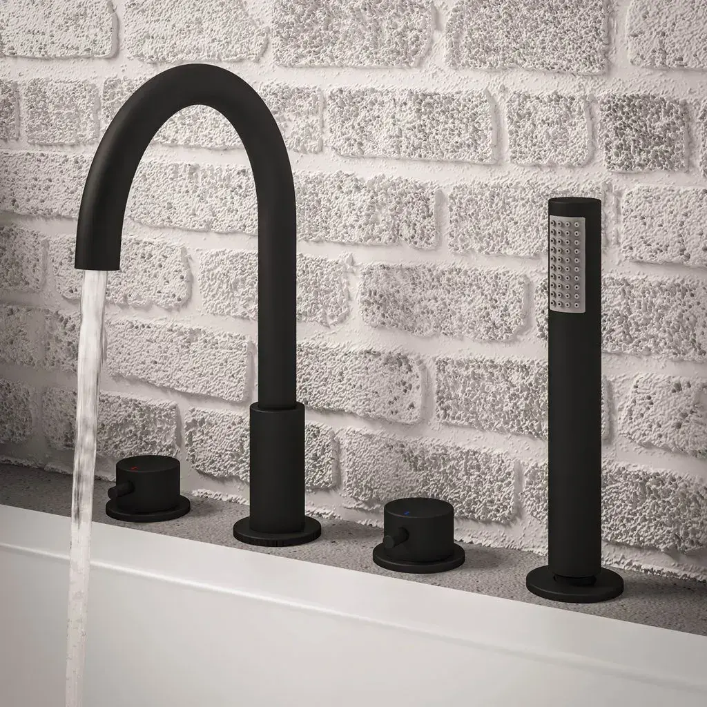 Discover the Meriden 4 Tap Hole Bath Shower Mixer Tap in Matt Black, a stylish and functional addition that enhances any bathroom setting with its sleek, contemporary aesthetic. Designed with a four-hole deck-mounted configuration, this mixer tap provides seamless water flow control and adds a bold touch of sophistication. Constructed from high-quality brass and featuring a modern matt black finish, its built to last and designed to impress.