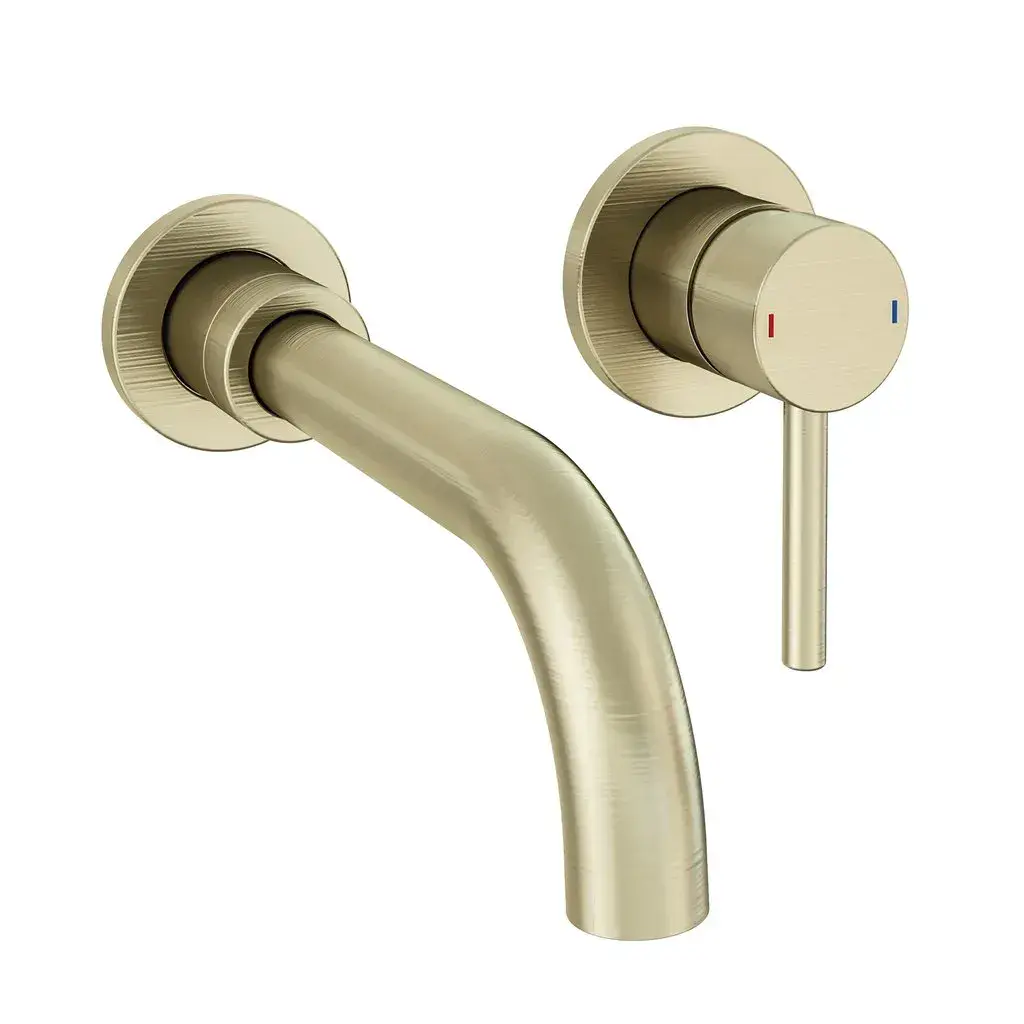 The Meriden Wall Mounted Basin Mixer Tap with Curved Spout - Brushed Brass exemplifies sophistication and modern design, seamlessly enhancing the aesthetics of any bathroom space. Its brushed brass finish adds a warm, luxurious touch while providing a durable surface that resists fingerprints and water spots. Crafted from high-quality brass, this mixer tap ensures long-lasting performance and reliability. The elegantly curved spout not only delivers a smooth flow of water but also adds a touch of refined elegance to your basin.