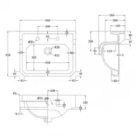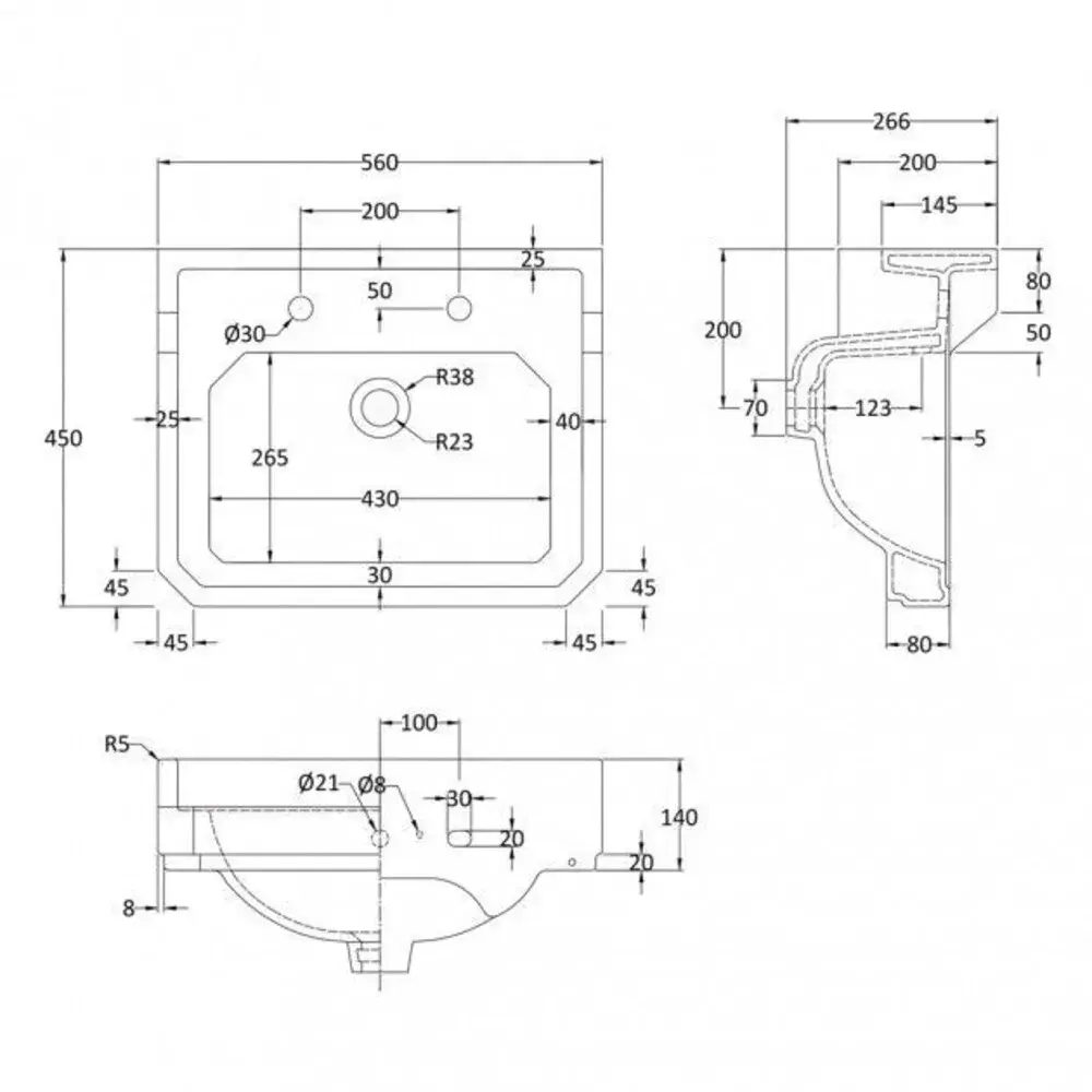 • Generous 560mm Ceramic Basin : Traditional rectangular design with integrated overflow and two pre-drilled tap holes for pillar taps.