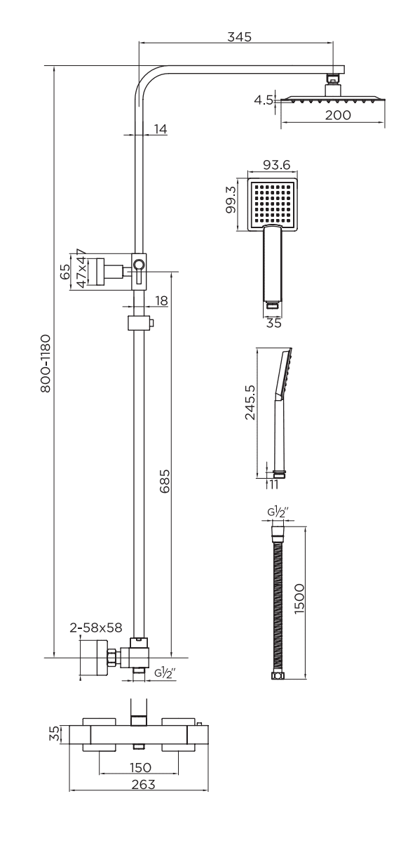 Supplied with a 1.5m hose, 200mm matt black shower head and single-function handset.