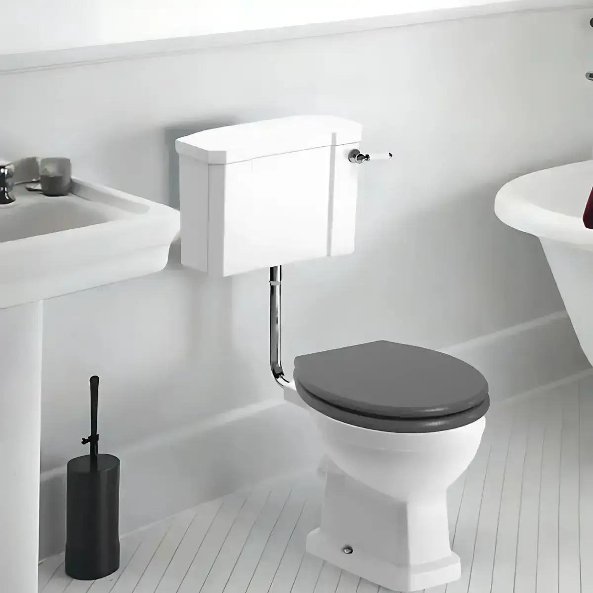 Victorian Style low level wc toilet pan with Victorian Style low level toilet cistern, including chrome flush pipe set and Grey Ash soft close seat.